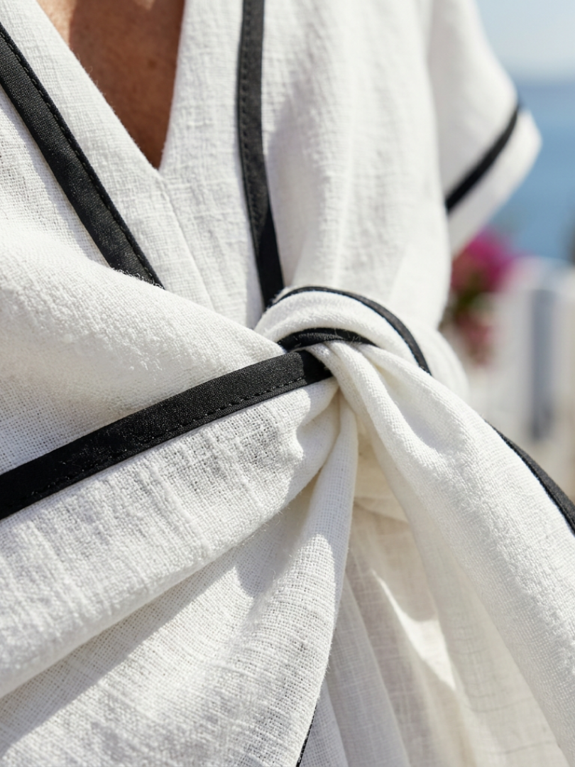 This dress features a flowing midi length with a soft V neck and short sleeves. The fabric has a light, smooth drape that allows the skirt to move easily while remaining comfortable throughout the day. A gathered detail at the waist adds gentle shape while keeping the overall feel relaxed and easy to wear.
